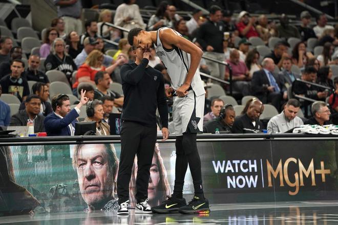 烏度卡試圖拿走文班亞馬的低位進(jìn)攻,當(dāng)文班亞馬拿球進(jìn)行夾擊,迫使文班亞馬出球,然后全員快速輪轉(zhuǎn)補(bǔ)位,然后放馬刺部分球員三分投射,其中申京先后對(duì)位瓦塞爾和尚帕尼,申京先后放掉瓦塞爾和尚帕尼,從而包夾文班亞馬。